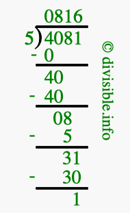 The image displays 816 at the top, which is the quotient, and 1 at the bottom, which is the remainder. Therefore, the answer to 4081 divided by 5 (4081 ÷ 5) using long division is 816 remainder 1, or simply 816 R 1.