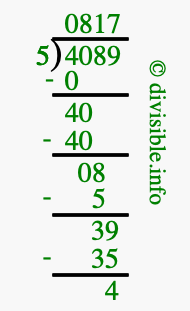 The image displays 817 at the top, which is the quotient, and 4 at the bottom, which is the remainder. Therefore, the answer to 4089 divided by 5 (4089 ÷ 5) using long division is 817 remainder 4, or simply 817 R 4.