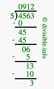 Here we will show you an image that illustrates how to calculate 4563 divided by 5 using long division. We will also give you the answer to 4563 divided by 5 (4563 ÷ 5) as a fraction and as a decimal.