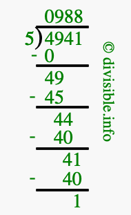The image displays 988 at the top, which is the quotient, and 1 at the bottom, which is the remainder. Therefore, the answer to 4941 divided by 5 (4941 ÷ 5) using long division is 988 remainder 1, or simply 988 R 1.