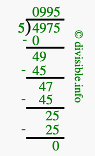 Here we will show you an image that illustrates how to calculate 4975 divided by 5 using long division. We will also give you the answer to 4975 divided by 5 (4975 ÷ 5) as a fraction and as a decimal.