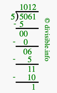 The image displays 1012 at the top, which is the quotient, and 1 at the bottom, which is the remainder. Therefore, the answer to 5061 divided by 5 (5061 ÷ 5) using long division is 1012 remainder 1, or simply 1012 R 1.