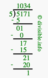 The image displays 1034 at the top, which is the quotient, and 1 at the bottom, which is the remainder. Therefore, the answer to 5171 divided by 5 (5171 ÷ 5) using long division is 1034 remainder 1, or simply 1034 R 1.