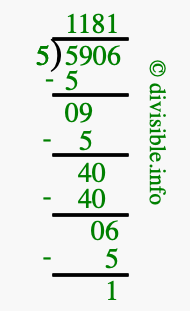 The image displays 1181 at the top, which is the quotient, and 1 at the bottom, which is the remainder. Therefore, the answer to 5906 divided by 5 (5906 ÷ 5) using long division is 1181 remainder 1, or simply 1181 R 1.