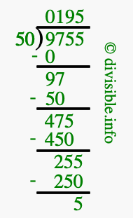 Here we will show you an image that illustrates how to calculate 9755 divided by 50 using long division. We will also give you the answer to 9755 divided by 50 (9755 ÷ 50) as a fraction and as a decimal.