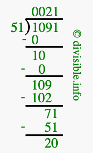 The image displays 21 at the top, which is the quotient, and 20 at the bottom, which is the remainder. Therefore, the answer to 1091 divided by 51 (1091 ÷ 51) using long division is 21 remainder 20, or simply 21 R 20.