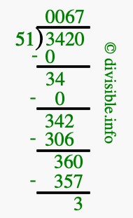 Here we will show you an image that illustrates how to calculate 3420 divided by 51 using long division. We will also give you the answer to 3420 divided by 51 (3420 ÷ 51) as a fraction and as a decimal.