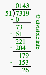 The image displays 143 at the top, which is the quotient, and 26 at the bottom, which is the remainder. Therefore, the answer to 7319 divided by 51 (7319 ÷ 51) using long division is 143 remainder 26, or simply 143 R 26.