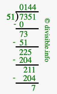 Here we will show you an image that illustrates how to calculate 7351 divided by 51 using long division. We will also give you the answer to 7351 divided by 51 (7351 ÷ 51) as a fraction and as a decimal.