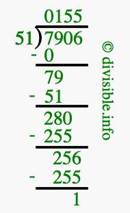 The image displays 155 at the top, which is the quotient, and 1 at the bottom, which is the remainder. Therefore, the answer to 7906 divided by 51 (7906 ÷ 51) using long division is 155 remainder 1, or simply 155 R 1.