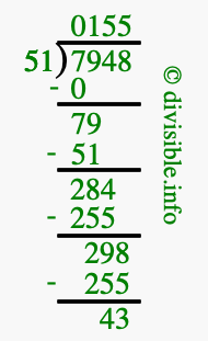 The image displays 155 at the top, which is the quotient, and 43 at the bottom, which is the remainder. Therefore, the answer to 7948 divided by 51 (7948 ÷ 51) using long division is 155 remainder 43, or simply 155 R 43.