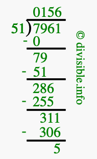The image displays 156 at the top, which is the quotient, and 5 at the bottom, which is the remainder. Therefore, the answer to 7961 divided by 51 (7961 ÷ 51) using long division is 156 remainder 5, or simply 156 R 5.