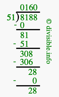 The image displays 160 at the top, which is the quotient, and 28 at the bottom, which is the remainder. Therefore, the answer to 8188 divided by 51 (8188 ÷ 51) using long division is 160 remainder 28, or simply 160 R 28.