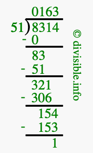 The image displays 163 at the top, which is the quotient, and 1 at the bottom, which is the remainder. Therefore, the answer to 8314 divided by 51 (8314 ÷ 51) using long division is 163 remainder 1, or simply 163 R 1.
