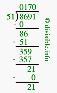 The image displays 170 at the top, which is the quotient, and 21 at the bottom, which is the remainder. Therefore, the answer to 8691 divided by 51 (8691 ÷ 51) using long division is 170 remainder 21, or simply 170 R 21.