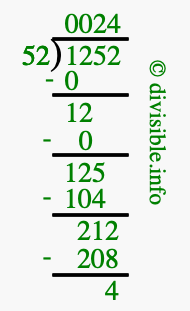 The image displays 24 at the top, which is the quotient, and 4 at the bottom, which is the remainder. Therefore, the answer to 1252 divided by 52 (1252 ÷ 52) using long division is 24 remainder 4, or simply 24 R 4.