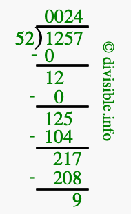 The image displays 24 at the top, which is the quotient, and 9 at the bottom, which is the remainder. Therefore, the answer to 1257 divided by 52 (1257 ÷ 52) using long division is 24 remainder 9, or simply 24 R 9.