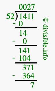 The image displays 27 at the top, which is the quotient, and 7 at the bottom, which is the remainder. Therefore, the answer to 1411 divided by 52 (1411 ÷ 52) using long division is 27 remainder 7, or simply 27 R 7.