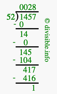 The image displays 28 at the top, which is the quotient, and 1 at the bottom, which is the remainder. Therefore, the answer to 1457 divided by 52 (1457 ÷ 52) using long division is 28 remainder 1, or simply 28 R 1.