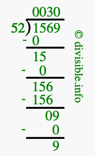 The image displays 30 at the top, which is the quotient, and 9 at the bottom, which is the remainder. Therefore, the answer to 1569 divided by 52 (1569 ÷ 52) using long division is 30 remainder 9, or simply 30 R 9.