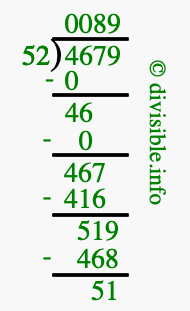 Here we will show you an image that illustrates how to calculate 4679 divided by 52 using long division. We will also give you the answer to 4679 divided by 52 (4679 ÷ 52) as a fraction and as a decimal.