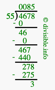 Here we will show you an image that illustrates how to calculate 4678 divided by 55 using long division. We will also give you the answer to 4678 divided by 55 (4678 ÷ 55) as a fraction and as a decimal.