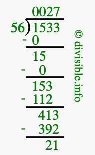 The image displays 27 at the top, which is the quotient, and 21 at the bottom, which is the remainder. Therefore, the answer to 1533 divided by 56 (1533 ÷ 56) using long division is 27 remainder 21, or simply 27 R 21.