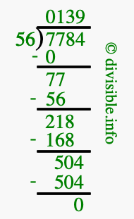 The image displays 139 at the top, which is the quotient, and 0 at the bottom, which is the remainder. Therefore, the answer to 7784 divided by 56 (7784 ÷ 56) using long division is 139 remainder 0, or simply 139 R 0.