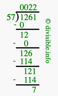 The image displays 22 at the top, which is the quotient, and 7 at the bottom, which is the remainder. Therefore, the answer to 1261 divided by 57 (1261 ÷ 57) using long division is 22 remainder 7, or simply 22 R 7.
