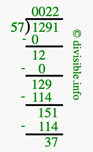 The image displays 22 at the top, which is the quotient, and 37 at the bottom, which is the remainder. Therefore, the answer to 1291 divided by 57 (1291 ÷ 57) using long division is 22 remainder 37, or simply 22 R 37.