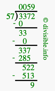The image displays 59 at the top, which is the quotient, and 9 at the bottom, which is the remainder. Therefore, the answer to 3372 divided by 57 (3372 ÷ 57) using long division is 59 remainder 9, or simply 59 R 9.