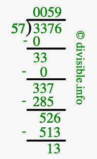 The image displays 59 at the top, which is the quotient, and 13 at the bottom, which is the remainder. Therefore, the answer to 3376 divided by 57 (3376 ÷ 57) using long division is 59 remainder 13, or simply 59 R 13.