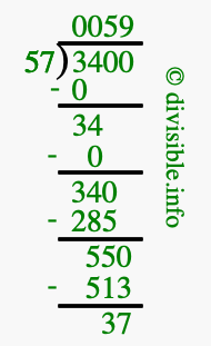 The image displays 59 at the top, which is the quotient, and 37 at the bottom, which is the remainder. Therefore, the answer to 3400 divided by 57 (3400 ÷ 57) using long division is 59 remainder 37, or simply 59 R 37.