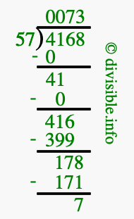 The image displays 73 at the top, which is the quotient, and 7 at the bottom, which is the remainder. Therefore, the answer to 4168 divided by 57 (4168 ÷ 57) using long division is 73 remainder 7, or simply 73 R 7.