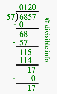 The image displays 120 at the top, which is the quotient, and 17 at the bottom, which is the remainder. Therefore, the answer to 6857 divided by 57 (6857 ÷ 57) using long division is 120 remainder 17, or simply 120 R 17.
