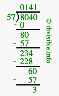 The image displays 141 at the top, which is the quotient, and 3 at the bottom, which is the remainder. Therefore, the answer to 8040 divided by 57 (8040 ÷ 57) using long division is 141 remainder 3, or simply 141 R 3.