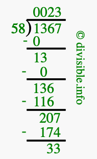 The image displays 23 at the top, which is the quotient, and 33 at the bottom, which is the remainder. Therefore, the answer to 1367 divided by 58 (1367 ÷ 58) using long division is 23 remainder 33, or simply 23 R 33.