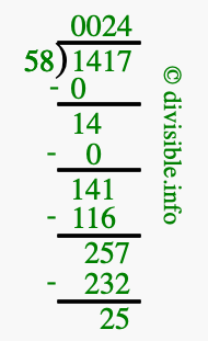 The image displays 24 at the top, which is the quotient, and 25 at the bottom, which is the remainder. Therefore, the answer to 1417 divided by 58 (1417 ÷ 58) using long division is 24 remainder 25, or simply 24 R 25.