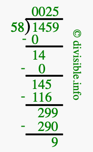The image displays 25 at the top, which is the quotient, and 9 at the bottom, which is the remainder. Therefore, the answer to 1459 divided by 58 (1459 ÷ 58) using long division is 25 remainder 9, or simply 25 R 9.