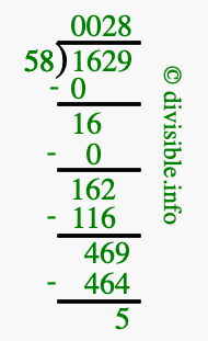 Here we will show you an image that illustrates how to calculate 1629 divided by 58 using long division. We will also give you the answer to 1629 divided by 58 (1629 ÷ 58) as a fraction and as a decimal.