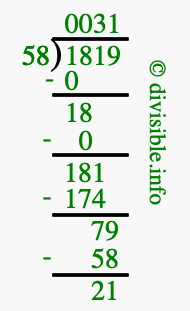 The image displays 31 at the top, which is the quotient, and 21 at the bottom, which is the remainder. Therefore, the answer to 1819 divided by 58 (1819 ÷ 58) using long division is 31 remainder 21, or simply 31 R 21.
