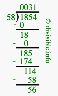 The image displays 31 at the top, which is the quotient, and 56 at the bottom, which is the remainder. Therefore, the answer to 1854 divided by 58 (1854 ÷ 58) using long division is 31 remainder 56, or simply 31 R 56.