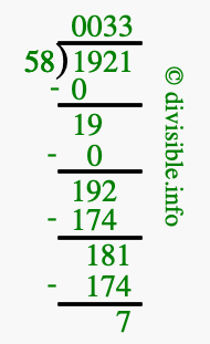 The image displays 33 at the top, which is the quotient, and 7 at the bottom, which is the remainder. Therefore, the answer to 1921 divided by 58 (1921 ÷ 58) using long division is 33 remainder 7, or simply 33 R 7.