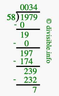 The image displays 34 at the top, which is the quotient, and 7 at the bottom, which is the remainder. Therefore, the answer to 1979 divided by 58 (1979 ÷ 58) using long division is 34 remainder 7, or simply 34 R 7.