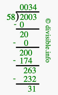 The image displays 34 at the top, which is the quotient, and 31 at the bottom, which is the remainder. Therefore, the answer to 2003 divided by 58 (2003 ÷ 58) using long division is 34 remainder 31, or simply 34 R 31.