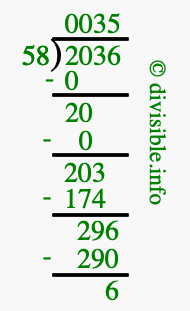 The image displays 35 at the top, which is the quotient, and 6 at the bottom, which is the remainder. Therefore, the answer to 2036 divided by 58 (2036 ÷ 58) using long division is 35 remainder 6, or simply 35 R 6.