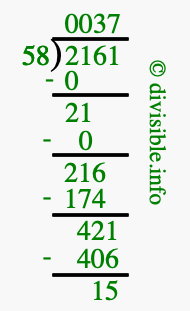 The illustration below shows you how to calculate 2161 divided by 58 using long division. As you can see, the dividend value of 2161 is located to the right of the "⟌" and the divisor value of 58 is located to the left of the "⟌".