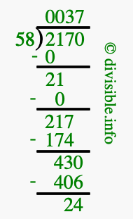 The image displays 37 at the top, which is the quotient, and 24 at the bottom, which is the remainder. Therefore, the answer to 2170 divided by 58 (2170 ÷ 58) using long division is 37 remainder 24, or simply 37 R 24.
