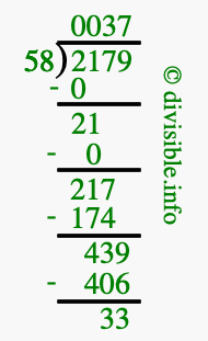 The image displays 37 at the top, which is the quotient, and 33 at the bottom, which is the remainder. Therefore, the answer to 2179 divided by 58 (2179 ÷ 58) using long division is 37 remainder 33, or simply 37 R 33.