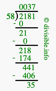 The image displays 37 at the top, which is the quotient, and 35 at the bottom, which is the remainder. Therefore, the answer to 2181 divided by 58 (2181 ÷ 58) using long division is 37 remainder 35, or simply 37 R 35.